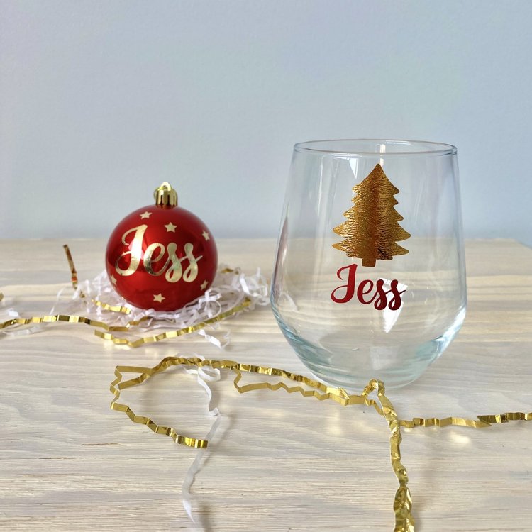 Includes a Personalised Tumbler Glass, Standard Tall Glass or Whiskey Glass + Personalised Christmas Bauble